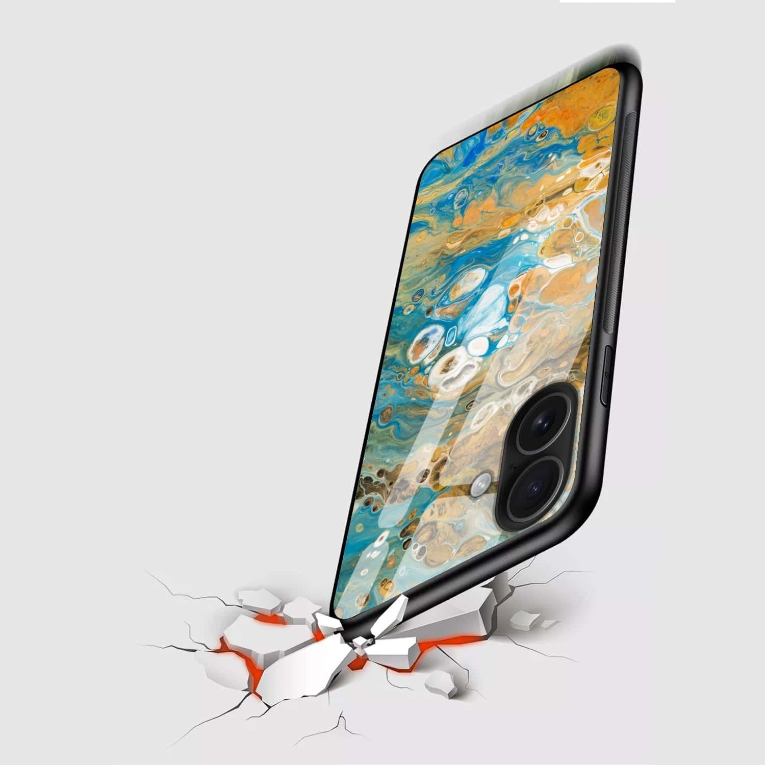 Experience artistic elegance and premium protection with our Abstract Ocean Swirl Phone Glass Back Cover. Designed with mesmerizing fluid-art patterns in vibrant shades of blue, orange, and gold, this case brings your phone to life with a stunning, modern aesthetic.
