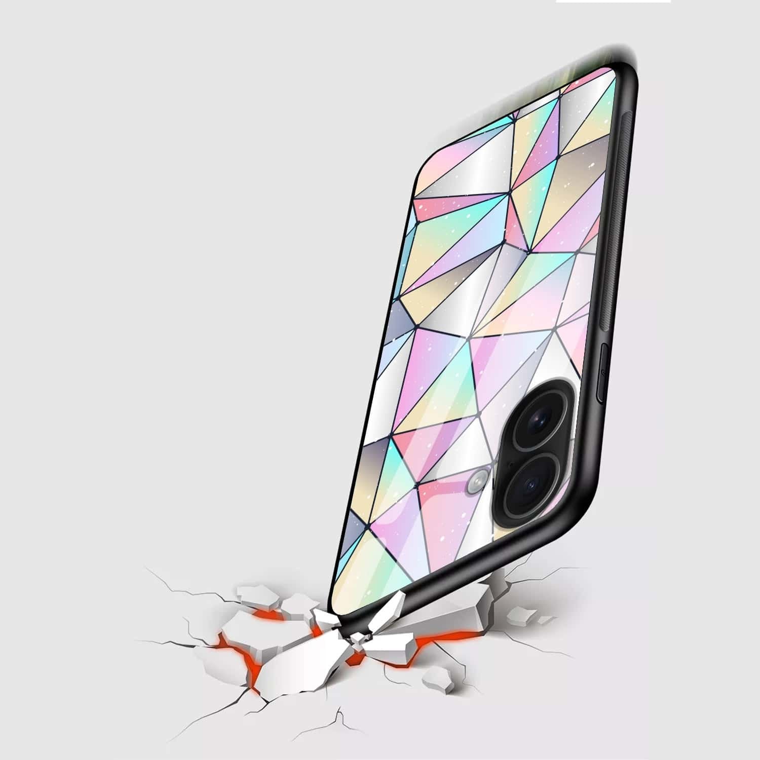 Introducing the Prism Glow Glass Back Protective Case, a stunning fusion of modern geometry and ethereal pastels. The design features a bold, abstract pattern of triangles with subtle black outlines, giving it a sophisticated, stained-glass look. The magic lies in the coloring—a beautiful, shimmering gradient of pale pinks, mint greens, soft blues, and subtle yellows that creates an iridescent, holographic effect under the light.